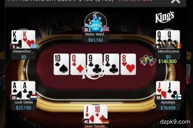 我们在盲注为$200/$400的常规桌上游戏中见证了有史以来最变态的一手牌之一。一个疯狂的三家全下,AA vs. KK vs. QQ,而一个玩家甚至在翻牌前就把JJ给弃掉了。这手牌发生200/400美元的高额常规桌,通常情况下桌上坐的都是些扑克老手,比如Leon Tsoukernik,Luuk "pokerkluka" Gieles和Alexandros Kolonias等人。这是一次六人制的无限注德州扑克,盲注200/400美元,前注100美元和800美元的straddle。在这手牌中,有效的筹码是110个大盲注,Luuk Gieles比Alexandros Kolonias和 "ManoloLama "更多一些。ManoloLama 在UTG+1用Q♠Q♣做了一个2000美元的加注,手持J♥J♣的Apustaja在按钮位跟注。娱乐场老板Leon Tsoukernik在小盲注用J♦T♦(T代表10)也加入战局。Luuk Gieles在大盲注拿着A♠A♣做了一个3-Bet到12,600。在他后面的Alexandros Kolonias看了看手牌K♣K♥,思考了片刻后全下38,800美元(97个大盲注)。ManoloLama很快推出了48,550美元(121个大盲注),Apustaja和Leon眼看局势不对立即弃牌抽身离场。行动回到Gieles手中,他不可能在翻牌前弃掉AA,所以这毫无疑问是一个跟注。Luuk Gieles: A♠A♣(67.53%)Alexandros Kolonias: K♣K♥(18.40%)彩池大小:$140,550,Luuk Gieles在三家全下的牌局中获得了67%胜率的巨大优势。但翻牌T♠Q♦9♣是残酷的,改变了一切,ManoloLama击中了三条,翻牌前最差的牌和最好的牌境遇翻转了过来。Alexandros Kolonias: K♣K♥(20.93%)Luuk Gieles的胜率从66.92%的大热门变成了8.97%的大劣势,ManoloLama 现在则有70.10%的机会拿下底池。与翻牌前相比,Alexandros Kolonias的胜率也有所提高,不过,在这种情况下,他只有3张补牌(两个K和一个J),因为Apustaja在翻牌前弃了口袋J,Leon Tsoukernik又弃掉了另一张。转牌的8♣没有改变局势,只是扩大了ManoloLama的领先优势。Alexandros Kolonias: K♣K♥(14.92%)