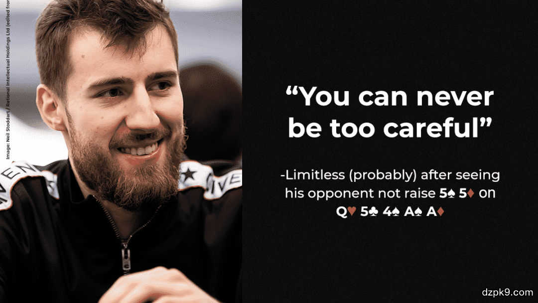 与之相反,Limitless仍然保留了所有两对组合和暗三条组合。此外,转牌改进了Limitless的AQ和AA,这两手牌Stefan都不可能拿到,因为他翻前会用这些牌3bet。