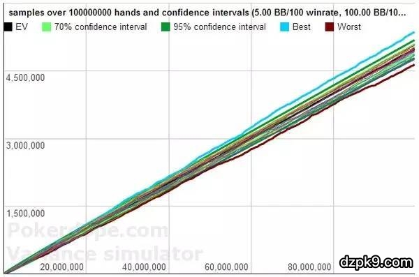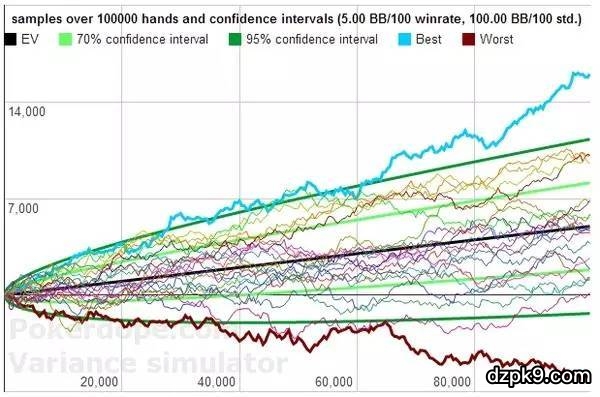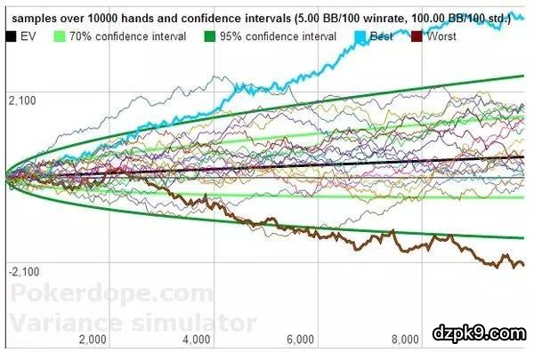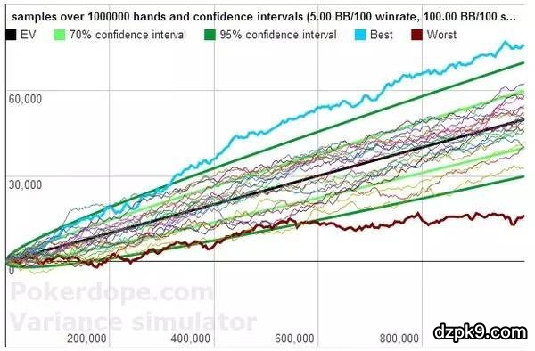 以上的模拟是建立在一直都保持5BB/100的盈利前提下的,可是现在的扑克技术水涨船高,玩家平均水平每年都在提高,保持盈利需要不断的进步和努力。