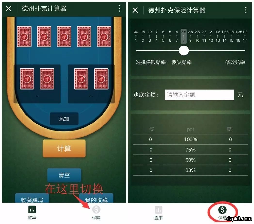 点击进入后,默认的页面是大家都常用到的【胜率计算】,如果你需要使用【保险计算】,点击最下方的按钮就可以进行切换: