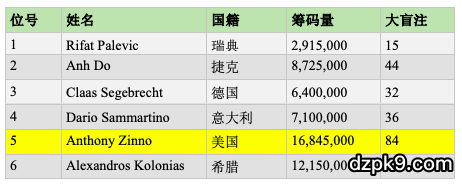 2019 WSOPE主赛六强诞生,目前领跑的选手是美国牌手Anthony Zinno,他的筹码量高达16,845,000。紧随其后的选手是当天开场筹码量倒数第二的Alexandros Kolonias(12,150,000),凭借着自身努力从倒数变成了正数。
