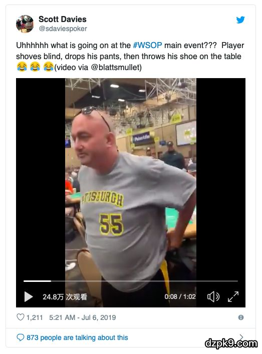 Kenneth Strauss在今年7月因在WSOP主赛场中脱裤子扔鞋等一系列奇葩举动引得圈内热议。但从Scott Davies当时上传的视频来看,Strauss更像是打赌输了后的恶作剧行为 。