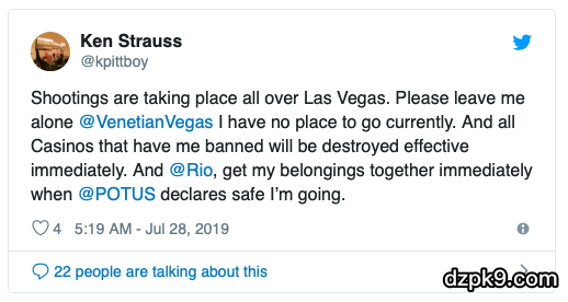 45岁的Kenneth Strauss今年夏天在WSOP主赛期间的不雅行为让所有人知道了他,随后他发布了多条具有恐吓性质的推特,目前已被拘留,被指控他犯有恐吓威胁罪和故意传播虚假谣言等恐怖主义行为。