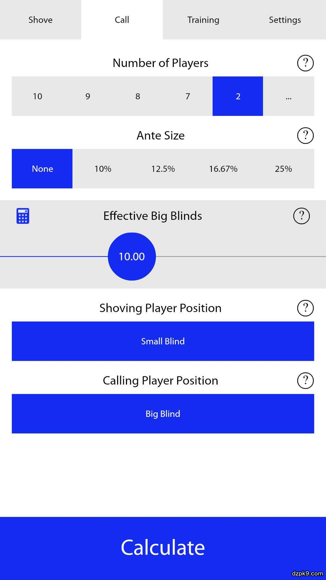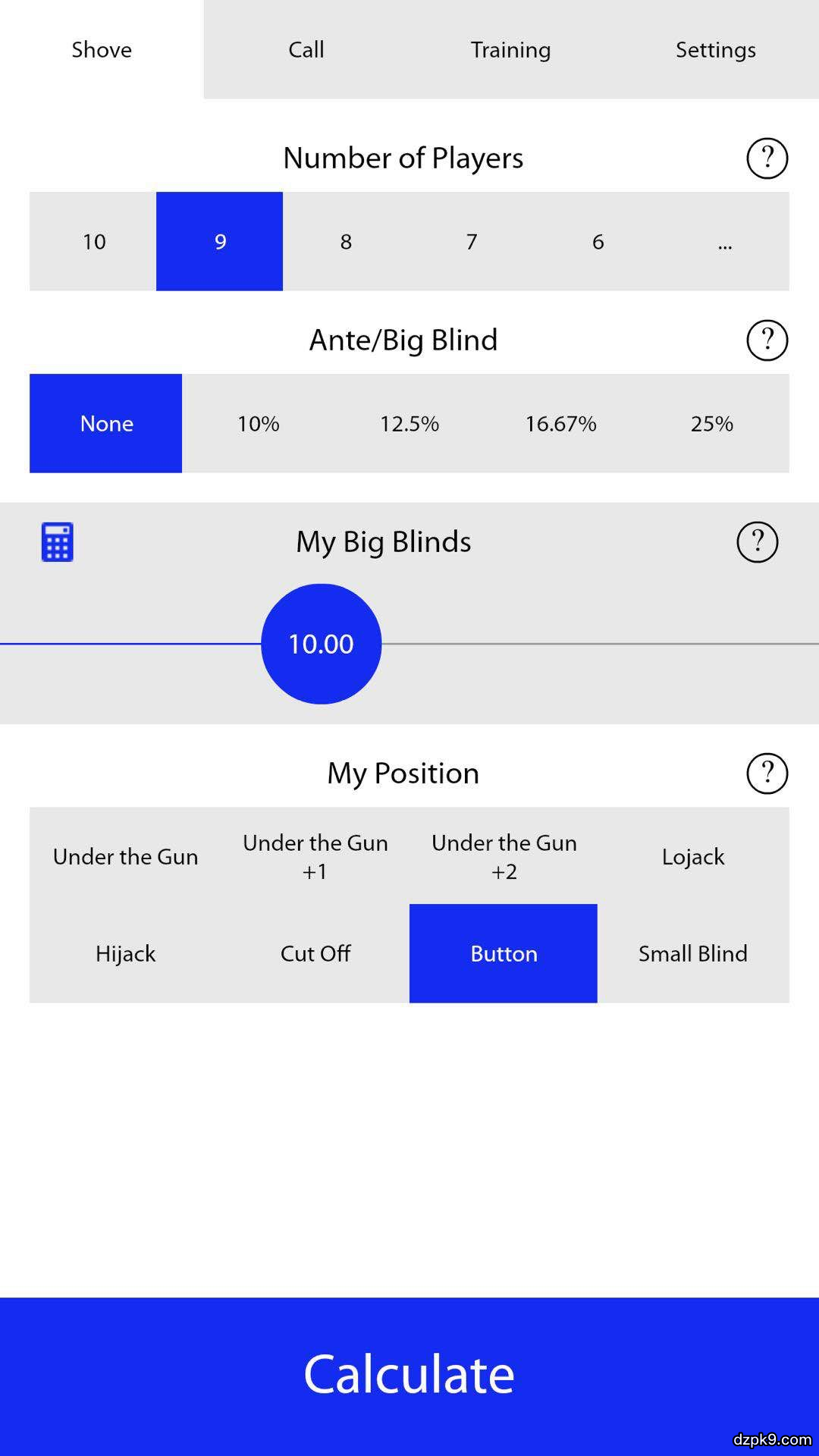 我们用9人桌,ante= 1/8个大盲, button位全下10BB,大盲位call的例子来说。