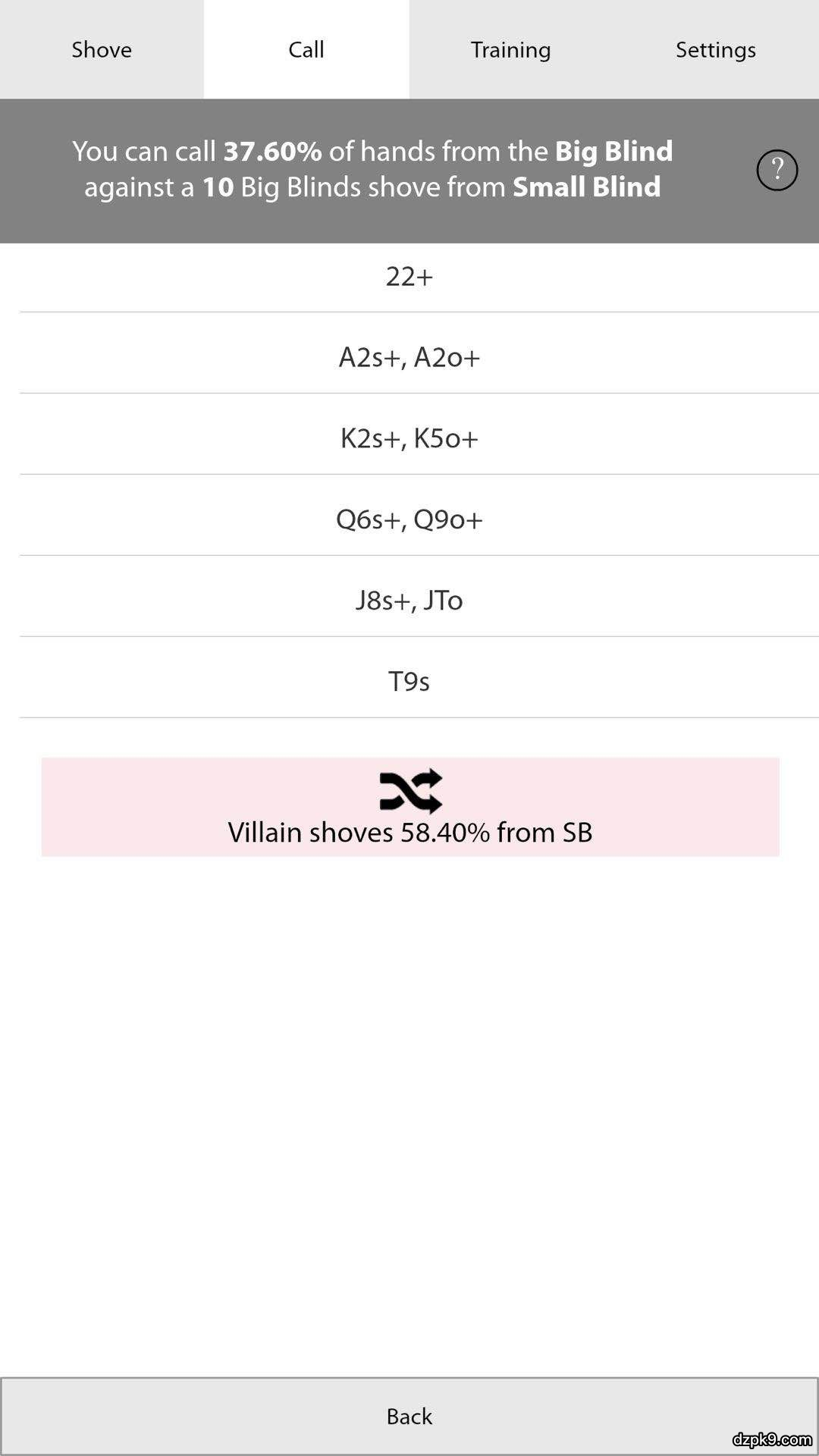 锦标赛2人桌,10BB,小盲shove,大盲T9s,是否应该call?