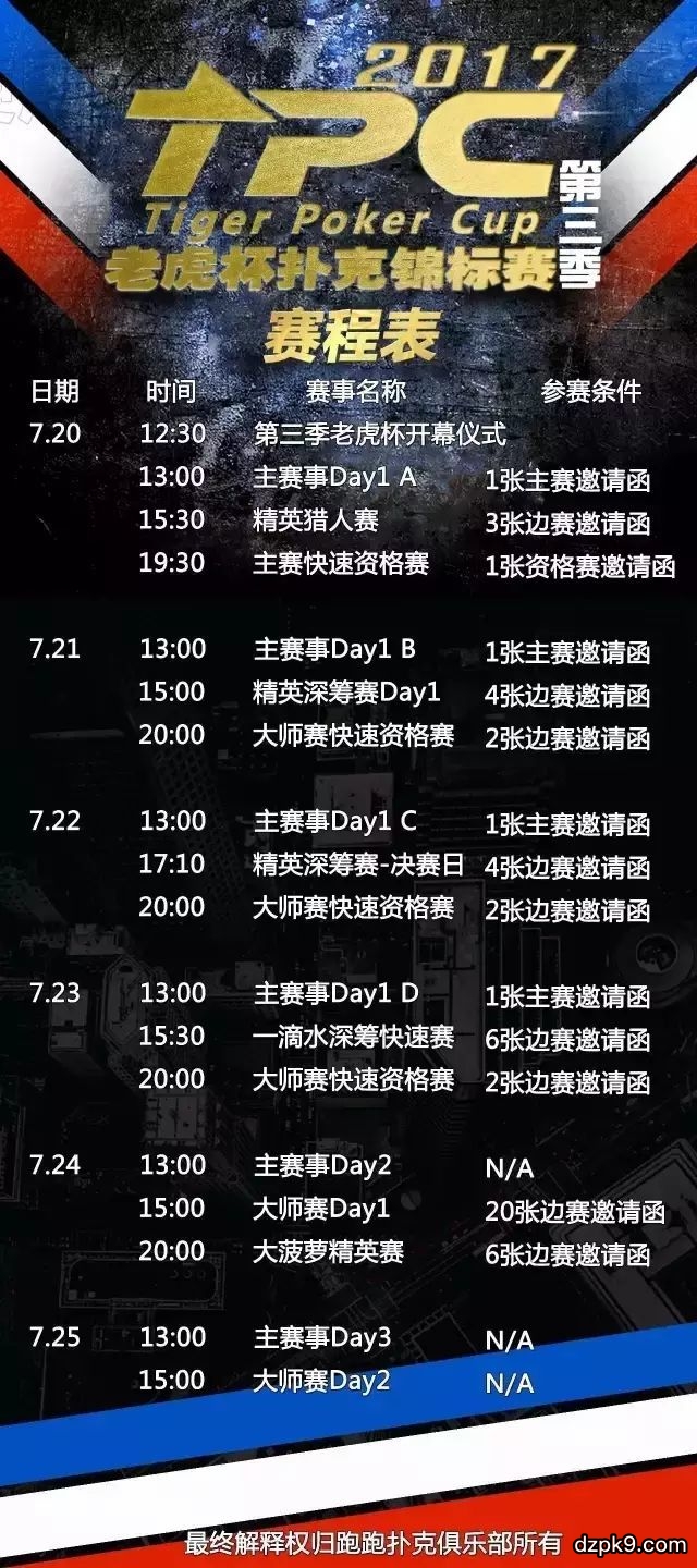 老虎杯第三季的主赛采取当日不可重进的模式,赛制更专业,赛程更合理,深受广大德扑玩家喜爱。