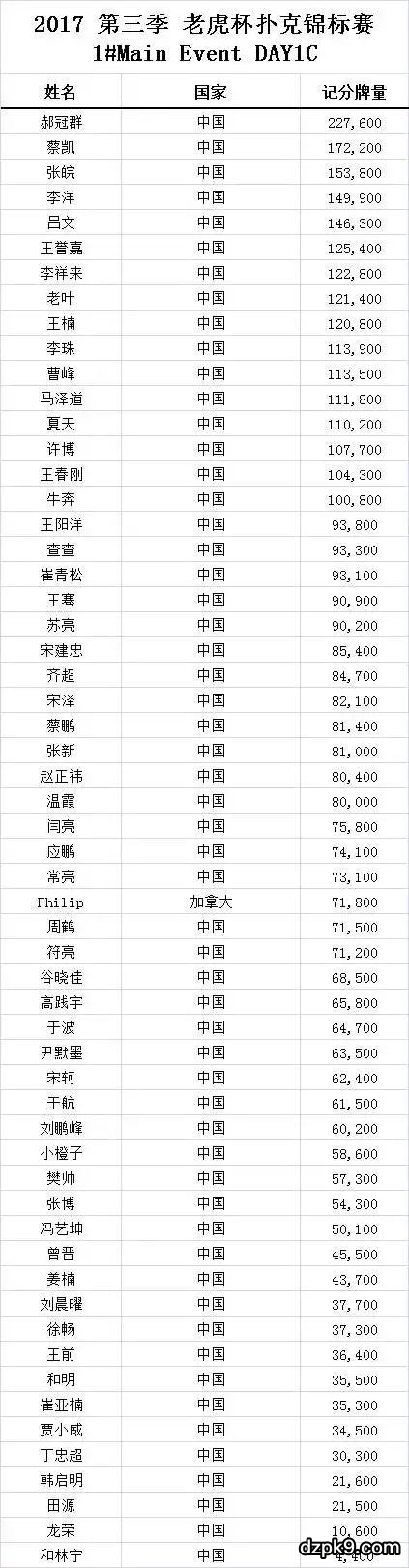 今日比赛总计232人次参赛,参赛人数创新高!58人脱颖而出顺利晋级Day2,老虎杯第一季冠军郝冠群凭借227,600记分牌荣登Day1C组筹码王宝座。