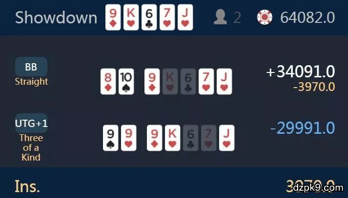 2.这里还要注意一个阻断牌的概念。由于hero手里有红桃9,那么在转牌,阻断了对手的89红桃,9t,9a红桃这样的听牌。从概率上来说,减少了对手这样的强听牌bluff的概率。