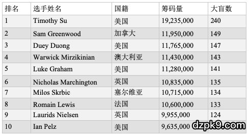 当随着5个级别全部打完之后,2019WSOP主赛事DAY5全部结束,这一天的残酷血拼使得最终只剩下106人晋级DAY6,而之前作为DAY2AB组CL的美国玩家Timothy Su今天坐拥19235000计分牌再次成为领头羊。