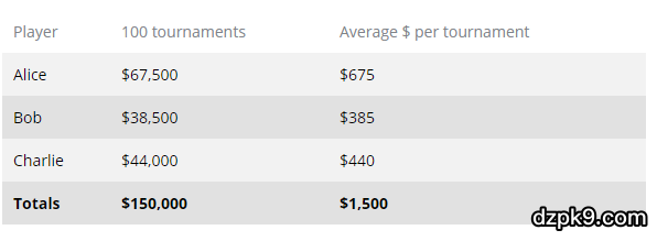 打个比方,来考虑一下以下这个假设的情况。假设Alice,Bob和Charlie以现有的筹码玩100次,然后记录下的获胜情况如下: