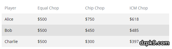 结果,Bob获得了一个很好的机会,尽管他是桌上经验最少的玩家。如果他能说服Alice接受她的ICM差不多的份额,那么他可以带回家的钱远远超过他预期的实际收益。果然,Alice根据自己的筹码量要求650美元(就是她要求比ICM高出32美元)。Bob高兴地接受从他自己的份额中支付Alice的溢价,最终的奖金分配如下: