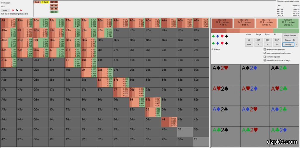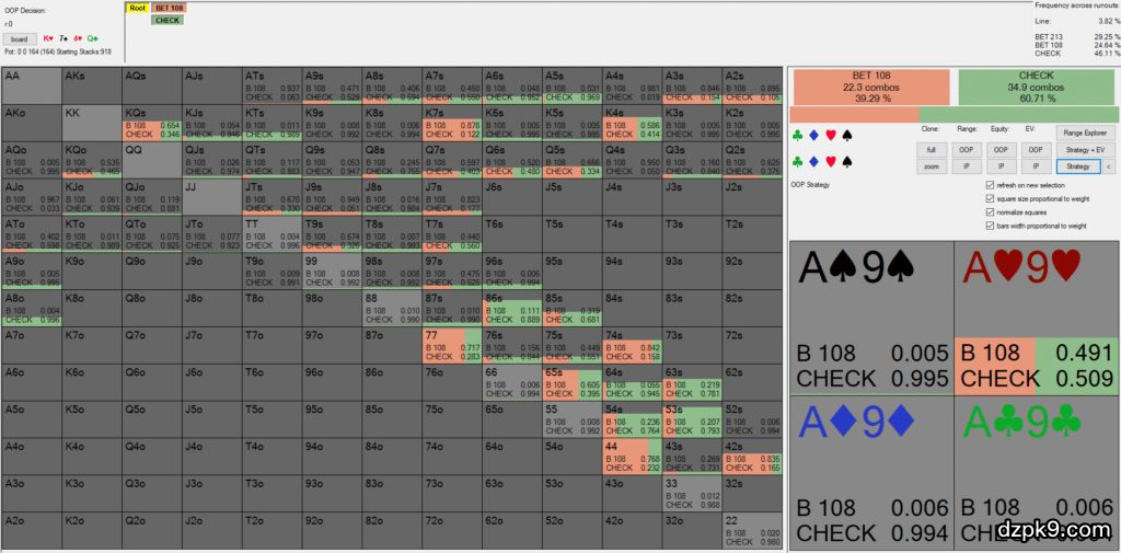 上图显示的是GTO算法得出的结果,从图片来看,站在GTO的角度,c-bet底池33%的数量是被用得最频繁的数量(亮橙色部分)。
