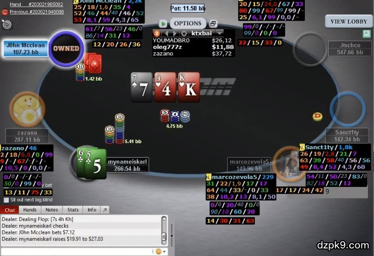 翻牌发出K♥7♠4♥,Fried选择过牌,JOhn下注约1.4bb,占底池33%的量,Fried过牌-加注到5.4bb,约为底池的55%,JOhn跟注。