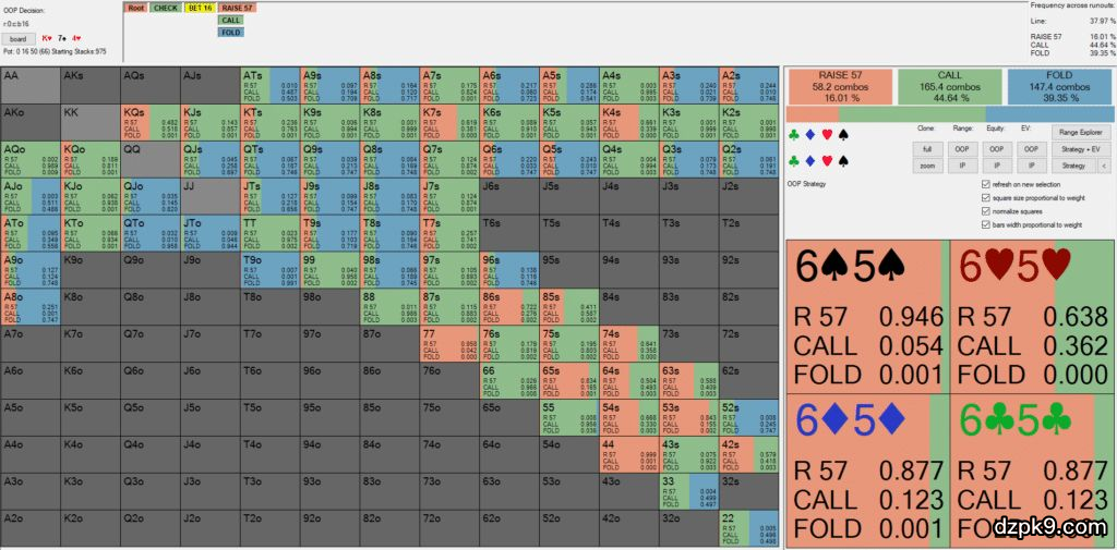 由图可见,GTO算法给出的过牌-加注范围里,65s是占了很高频率的,考虑到平衡范围的需要,这种建议很合理,为了搭配那些价值加注的牌型(74s、K4s、K7s、77和44),Fried在翻牌是需要用一些诈唬牌型进行加注去平衡范围的,而65s这手牌是用来加注的理想牌型,理由有两个: