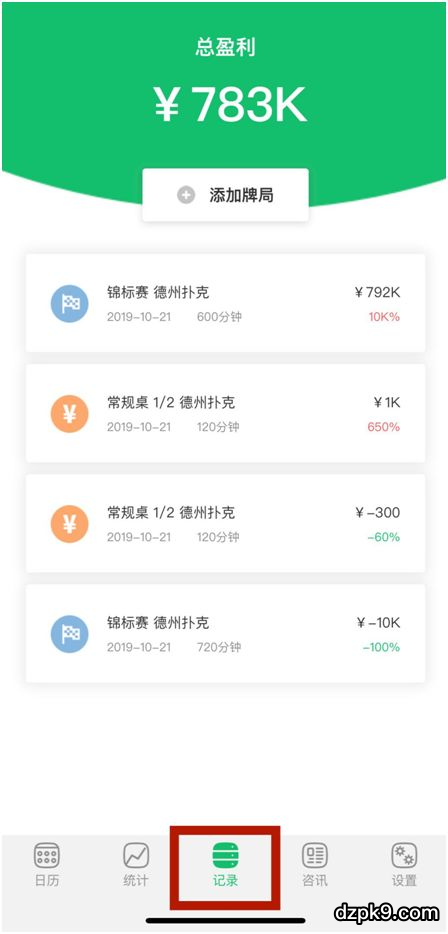 在日历一栏,点击相应日期,则可以看到当日所记录的牌局