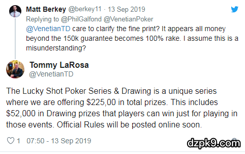 线下赛事奖金累计超过400万美元的职牌Matt Berkey发推@威尼斯扑克赛事总监,问总监这事是不是一个误会,他说扑克室不会真的想将超出15万刀保底的钱都吞了吧?希望他出面解释一下!谁知道总监Tommy LaRosa在打官腔,没有正面回答Berkey的问题,但也没有否认抽取高佣金的事实,他只说:“这次比赛的赛制很特别,我们准备了225,000美元的保底,其中包括52k的听牌奖励,玩家只要参加那些比赛就有机会获奖,稍后我们会在网上公布官方的赛规。”