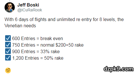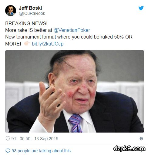 12日的时候,Boski发推文说:“号外!号外!威尼斯人扑克室开始走‘水多更好’的路子了!大家点开看他们的新赛制,看完后你会发现参赛玩家付的水钱可能高达50%或更多!!!”