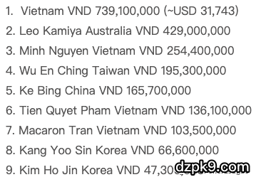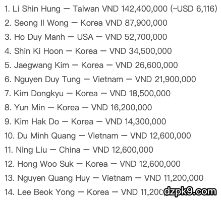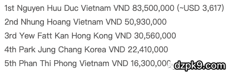 在这项赛事中,一共有14名选手进入了奖励圈,而台湾的李申雄则在比赛结束后高居榜首。这不仅为他带来了一个漂亮的冠军奖杯,更是拿到了142,400,000越南盾(约合6,116美元)的奖励。
