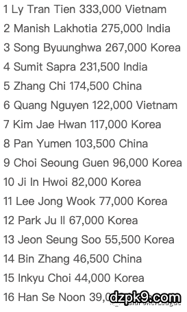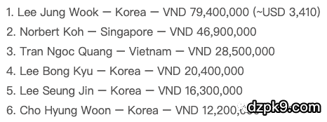 来自韩国的Lee Jung Wook是站到最后的一人。他的胜利为他赢得了79,400,000越南盾(约合3,410美元)的冠军奖励。