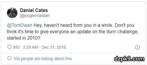 “嘿,好久没你的继续消息了。你觉不觉得我们该跟大家交代一下Durrrr挑战赛的进度,2010年开始的那场?”