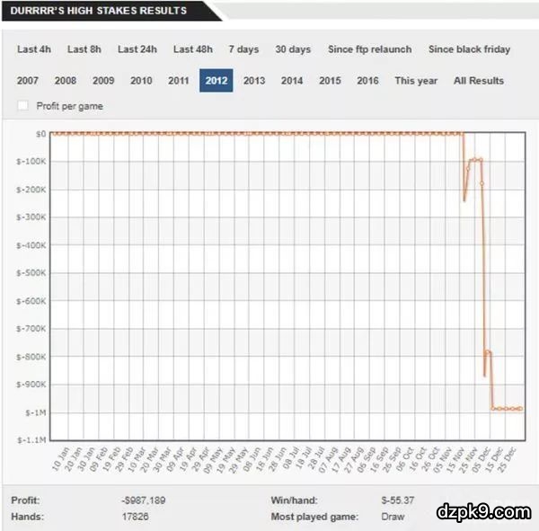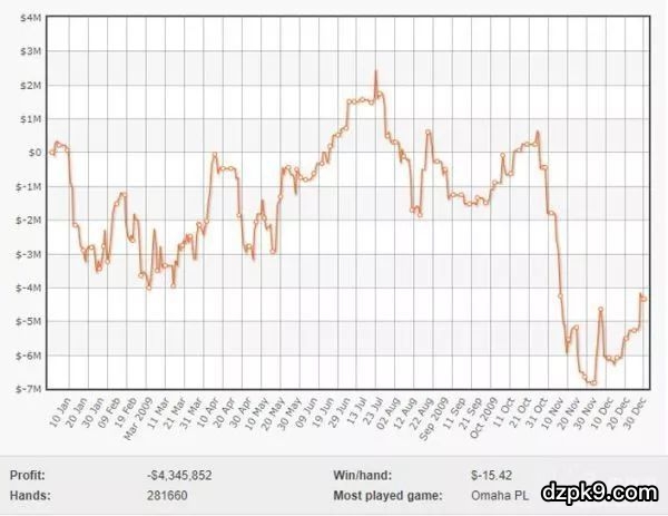 那一年(2009年)也被证明是Dwan最疯狂的一年。从下面的曲线图,你能看到Dwan在高额桌的波动是有多大......