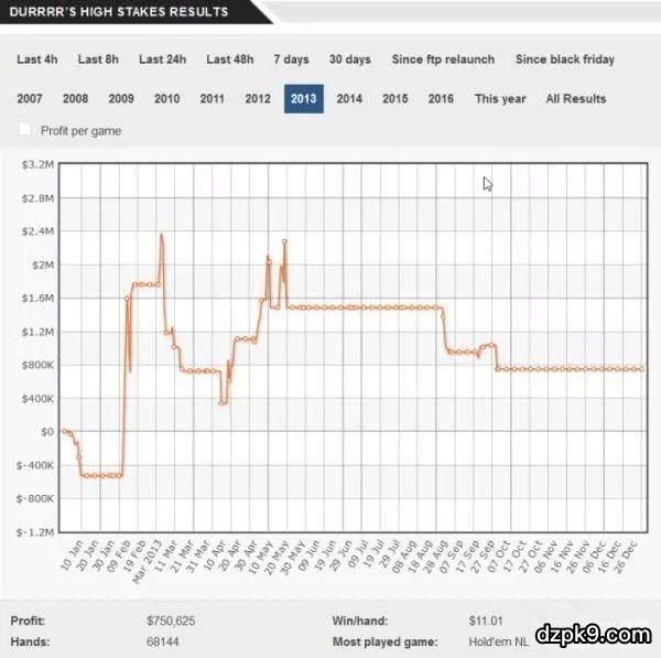 2012年和2013年线上扑克整体并没有之前那么火爆,不过Dwan依然凭借他个人无以伦比的风格,创下了上百万美金的收入。不过以他离经叛道的激进牌风来看,他赢钱也没什么好惊讶的。