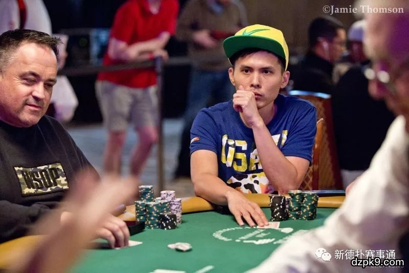 由于场上只剩下21名选手,因此每桌7人。Song在庄位open至25,000,来自小盲位的Tan Nguyen对他3-bet到95,000,Song跟注。