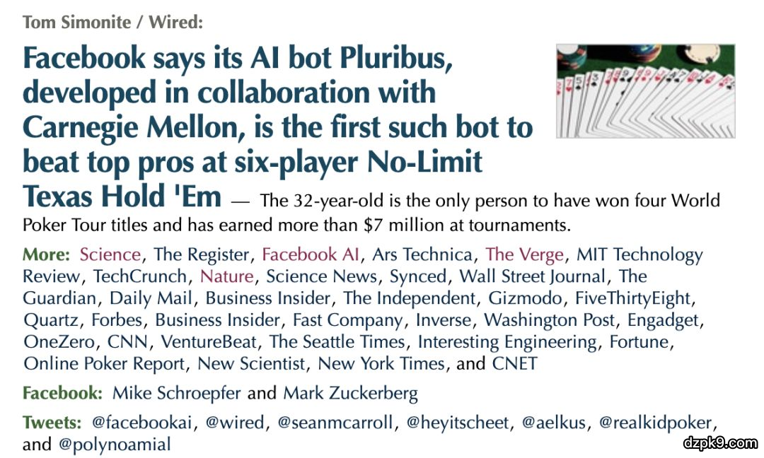 一款名叫“Pluribus”的AI扑克牌机器人在六人无限制德扑APP这项复杂游戏中,碾压了人类职业选手!——这是AI机器人首次在规模超过两人的复杂对局中击败顶级人类玩家。