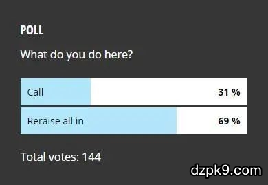 在这个例子中,我们可以再加注到全压,给初始下注者和加注者施加巨大压力。有些时候我们可以在翻牌圈不经战斗即赢下底池。