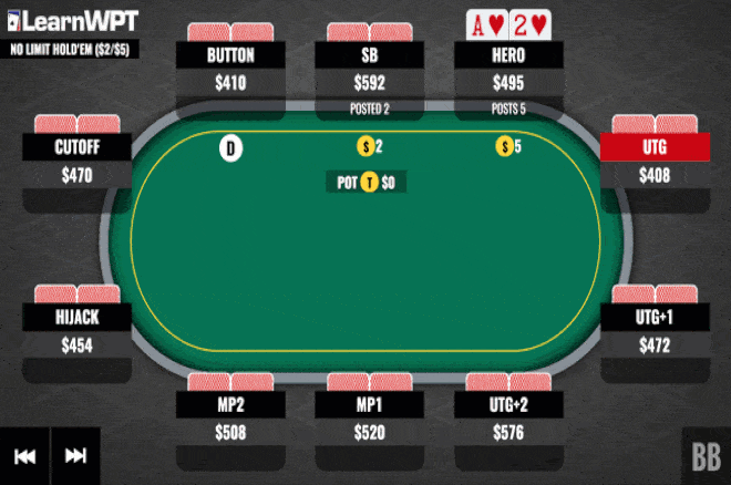 翻前,UTG+2玩家率先加注到20美元,CO玩家跟注,你在大盲位置用A♥ 2♥跟注。底池现在有62美元。