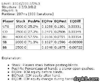 纳什均衡的一个巧妙使用是评估被盲注蚕食的损失。在枪口位置用一手比根据ICM模式和对手的范围推测出的正确范围更弱的牌全压往往是正确的。其原因是,弃牌并没有ICM认为的那么高的价值,因为下一手牌投入的大盲注是很费钱的。全压可能意味着你出局,因此你下手牌不必投盲注。如果你被跟注,然后筹码翻倍,你仍然不得不投盲注,但这种损失在锦标赛权益上可能比较低。我们来看一个例子。