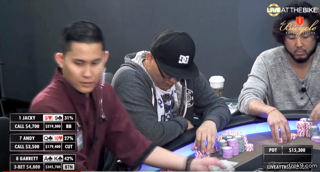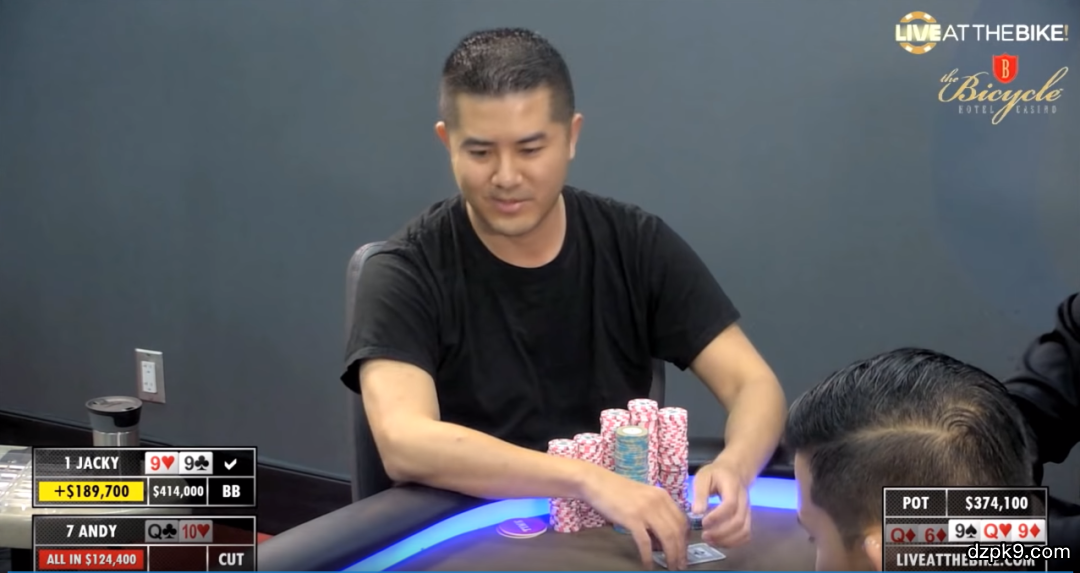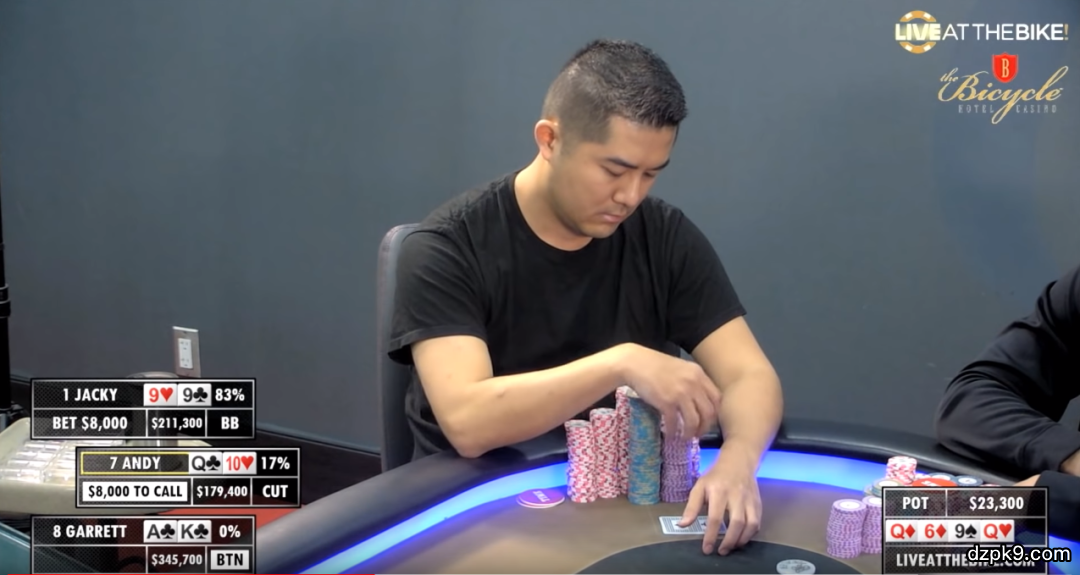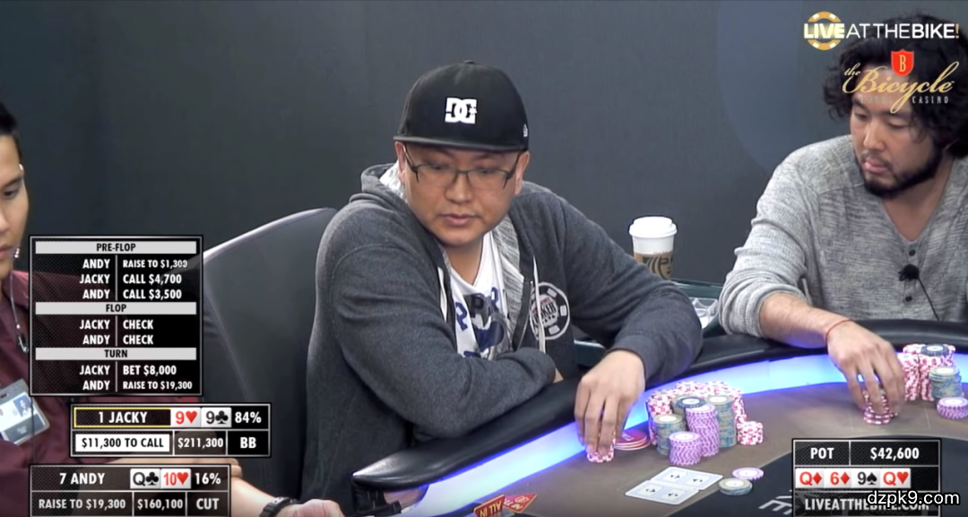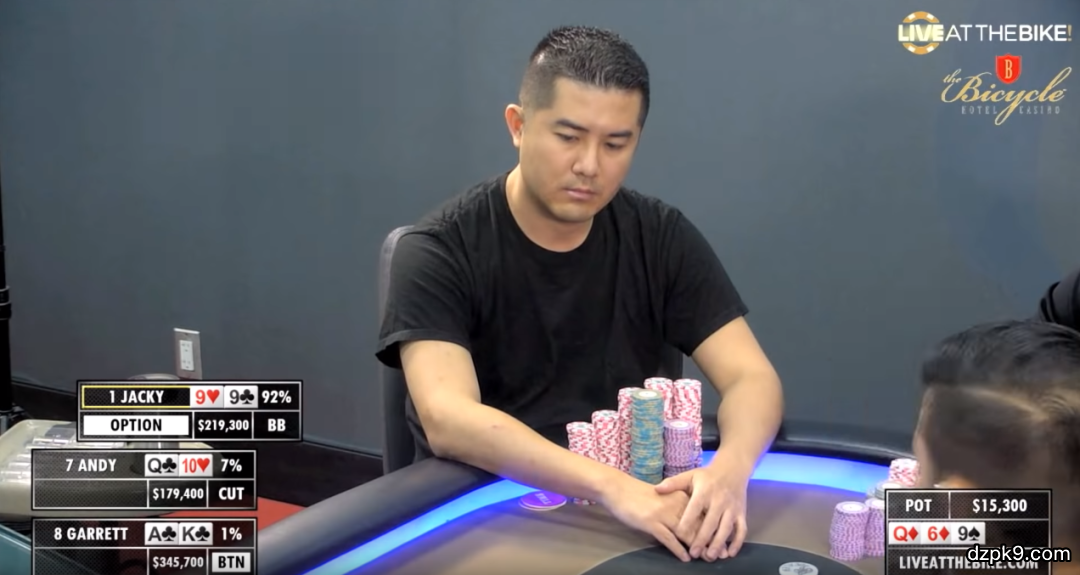 很久没写关于德州扑克的文字了,上周五的Live at the bike(注:2019年5月的一场比赛),两位亚洲牌手引爆了LATB(Live at the bike)有史以来最大的pot:438,900美金,恰巧我与其中一位牌手有一些交往,借此机会,我想写一些我对这手牌的看法。这是LATB周五的high stake live cash game。在Poker After Dark制作每况愈下的情况下,每周五西海岸的Live at the bike成为除WSOP期间外全美最精彩的cash game公开局。而本周五的high stake game聚集了几乎所有LATB的精英玩家,此为背景。这手牌盲注为100/200/400美金。CO位Andy后手184200美金手持QcTh,open 1300,BTN位Garrett后手350500美金手持AsKs,3bet 4800,BB位Jacky手持9h9s,后手224000美金冷call,Andy call。其实这个preflop没什么好说的,Garrett的3bet非常标准,Jacky的冷call也没问题,虽然他是oop,但在这个500bb+这个区间,99冷call明显会比4bet好的多。如果4bet,这里将会面临Garrett或者Andy的一个5bet会非常难受,几乎在preflop就得缴械投降;如果Garrett或者Andy call了Jacky的4bet,Jacky的99会面临多达20个outs的帽子的极度两极化范围,这些帽子几乎覆盖了Garret和Andy所有可以call 4bet的范围。3bet既能给Andy一个合适的赔率call进来,也让自己的99有一个击中set或者看到一个自己想看到的flop的机会。同时在大家都是500bb+的这个深度中,来玩儿一个宽泛的范围。很不幸,这里Andy很不明智的也call了这个3bet。以他的水平,QTo这样的牌在翻前是什么样的质量他应该很清楚,但他之前因为开局就被bad beat,所以不争气的上头了。即使他后来还是有机会逃脱掉被清干净的境地,这是后话。Jacky在这里击中了set,选择过牌。很正常,没什么可以讨论的。Andy在这里也选择了过牌,我喜欢这个过牌,因为QTo这里虽然是Top Pair,但是很容易在这个multiway pot被Garrett和Jacky两人的联合范围统治,在flop下注做大底池对QT这种只是一个top pair的牌来说没有任何好处,反而很容易受到极大的伤害。随后Garrett也选择了过牌,非常标准,AcKc在这个board没有任何的connectivity,也没有任何的blocker。