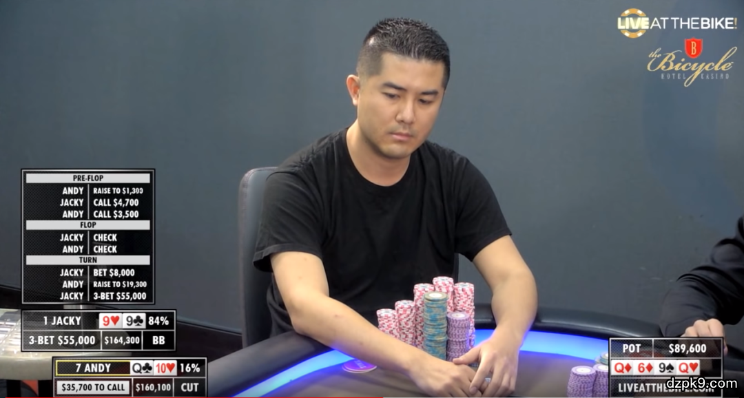 随后Andy raise到19300。我喜欢这个raise。首先,turn的第二张Q移除了大量的Qx组合,这又是一个3bet底池,Garrett和Jacky的范围不太可能有Q2-Q9这样的组合,所以Andy这里的QTo很有可能是最好的。其次,Jacky flop check+Andy check+Garrett check,Jacky的范围里含有大量semi-bluff,mid pair,纯bluff,而Garrett的范围里也含有和jacky相同的范围。Andy这里的raise可以很好的拒绝对手这些底池权益,随后Garrett fold。但是,真正的好戏才刚刚开始。令Andy吃惊的是,Jacky随后3bet到了55000。Jacky的这个3bet不必多说,因为Andy的这个raise已经暴露他范围里大量的Qx甚至66。这时候Jacky现在所做的只需要去来评估Andy的那些比他差的价值范围,根本不用考虑太多Andy的诈唬范围,因为Andy的诈唬范围已经drawing dead。而此时Andy非常尴尬,因为Jacky此时的范围极度两极化。他的范围包含了很多比Andy更好的Qx,甚至66,99。但他的范围仍然有一些AdXd/KJs/JTs/T9s这样的semi-bluff来扮演刚才提到的premium hands。Andy这里没办法继续4bet,因为他的4bet只能招来比他更好的牌,打走比他更差的牌。但他也不能fold,因为Jacky两极化的范围必然存在另一极,也就是诈唬范围。而且Andy还有10个outs可以反超或者平分这手牌。更重要的是,大家都是深筹码,即使Andy面临如此窘境,他也没有套池。所以他这里必须call,也只能call。River 9。这是一张对Jacky来说完美到不能再完美的dream card。这张9不仅让自己的99做成了四条,而且也让对手的Qx组合拿到了看似完美的顶葫芦。现在Jacky需要想的就是如何一口气吃掉Andy。而他的做法是选择了check。现场直播的时候,很多人对这个check拍案叫绝。但其实仔细分析后,Jacky的这个check其实是给了Andy逃脱掉这个噩梦般底池的绝佳机会,但是Andy没有把握住。这里我需要把双方的牌力以及双方在对手眼中的牌力逐个剖析,这样大家才能知道为什么Andy在这里有机会逃脱。在经历了turn上raise Jacky反而被3bet后,Andy看到了Jacky最希望看到的action:check。再加上这张貌似Andy的dream card的出现, Andy天真的认为,这里他的QTo已经胜券在握了,至少也是保持不败。因为Andy认为他的牌貌似无法被击败,所以他在这里选择了下注70000。但Andy忽略了一个德州扑克里最原始,也是最重要的因素:你下注的目的是什么?在德州扑克中,下注的原因无非两点:用你的价值范围赢到别人比你小的价值范围的钱,或者把用下注来扮演一手比对手的价值范围更大的价值范围从而把对手吓跑,也就通常所说的诈唬。River Jacky的check给了Andy如下信息:他的66被counterfeited了,也就是通常所说的被淹了。而自己的QTo现在比66大了;Jacky的semi-bluff破产了;Jacky也有Qx。可是无论是以上几种情况的哪一种,首先来说,如果Jacky是66,在turn上经历了3bet后,你在Jacky眼中的范围明显有很多Qx的组合,在river完成公对葫芦后,Jacky真的能用自己的66来去跟注明显有Qx组合的自己吗?其次,如果Jacky的semi-bluff破产了,Jacky会用破产的诈唬组合来去跟注你这么明显的Qx价值组合吗?第三,如果Jacky也有Qx,一个明显有可能平分钱的底池中,你的这个下注意义何在?举个极端的例子,在一个AKQJT的皇家同花顺board上,当oop(out of position)对手check时,你的下注肯定是一个无效的bet。同理,当大家的范围都有Qx的时候,你所谓的价值下注其实也是一个无效的价值下注。当然你可以赢到有9的小葫芦组合,可是Jacky的turn 3bet组合中,9x会有什么组合呢?综上所述,如果Andy真的能想清楚这几点,尤其是最后一点,当在Jacky的river check后,其实这里Andy有且只有的唯一选择就是check back。可惜,Andy在这场牌局中把他的缺点暴露无遗。他被Jacky设下了 一个其实不算陷阱的陷阱,成就了Live at the bike史上最大的pot。