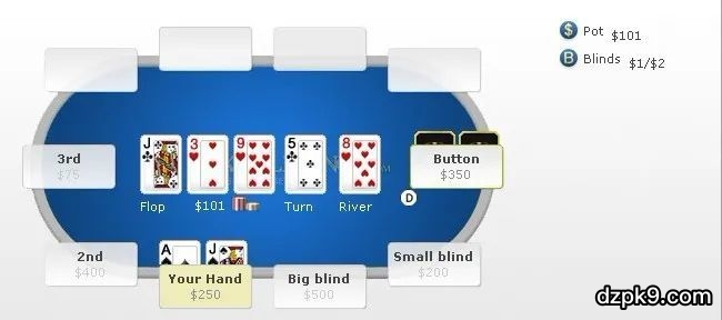 在线6人桌,NL1/2,按钮位置是一位不错的玩家,你从没见他有超常规的举动,但你也注意到,他不是德扑职业选手。桌上其他人则是良莠不齐,有玩的好的,也有玩的差劲的。这手牌你在枪口位手持A♠J♠加注到$7,后面玩家弃牌,按钮位玩家跟注,大小盲弃牌。