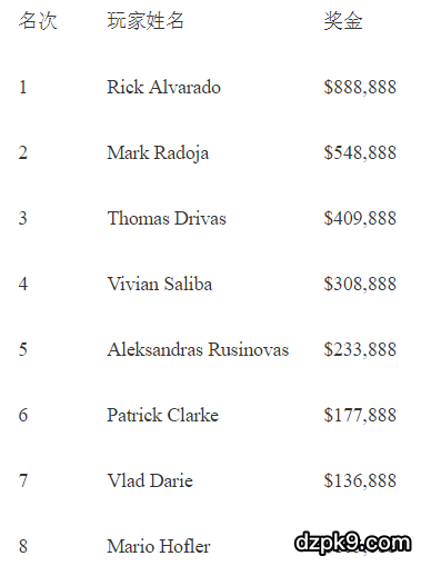经过四天的苦战后,曾是快餐工作人员的Rick Alvarado摘得比赛桂冠,揽获奖金$888,888和职业生涯第一条金手链。