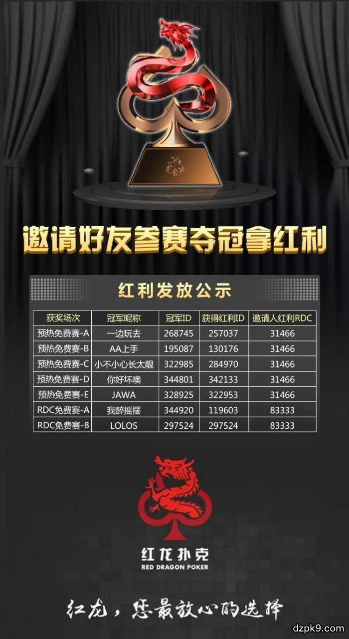 同时,红龙online免费赛已全面上线,首场开幕赛将于4.13日正式打响,4.13-4.19日,连续七天每晚20:00,4000万保底RDC,7座红龙奖杯等你拿!即日起,每天下午16:00,一场以小博大,10张主赛门票保底卫星赛。