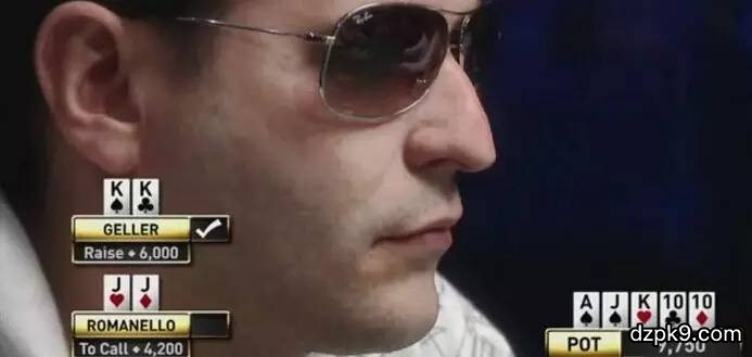 2009年WSOP(世界扑克系列赛)诞生了无数的经典时刻,这次经典的弃牌发生在WSOP2009主赛事的第一天,Geller在前位拿到了K♠K♣加注到600,小盲注位置的“大嘴”Matusow拿到了9♥9♦仅仅跟注,大盲位置的主人公Romanello拿到了J♥J♦,也仅仅只是跟注。