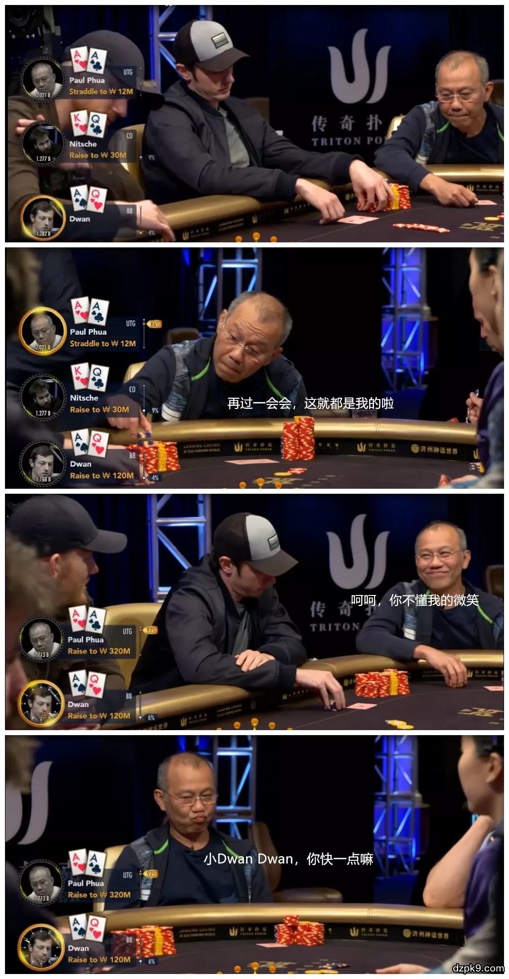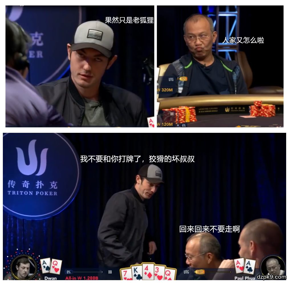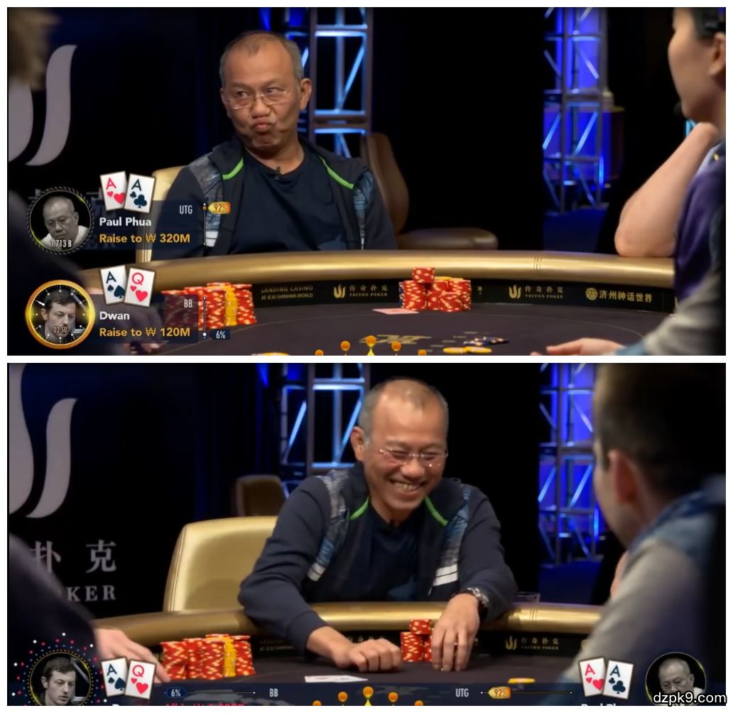 马来西亚富商Paul Phua在牌桌上并没有什么光鲜靓丽的成绩,但是他是一位牌技实力深厚的牌手。下面要说的是他与Dwan的两手切磋牌局,一手成功诈唬牌加上一手AA碾压,导致Dwan立即起身离场:告辞,不玩了!