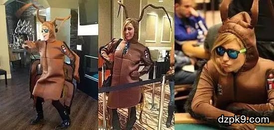 哈哈哈哈,提到奇葩穿着,不得不说2012年Vanessa Rousso在和Live Boeree的一次射击打赌中输了的故事。最后她不得不穿着这身蟑螂装去打德州扑克。她说,那天她准备好去面对拉斯维加斯的任何“核灾难……