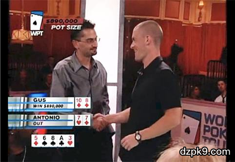 (译者注:世界扑克巡回赛上,安东尼奥持7h 7d手对公开加注,盖斯持10d 8d 3-Bet,安东尼奥长考之后all-in,盖斯跟注。亮牌之后安东尼奥一脸不可置信。牌面为5d 6s 8s Ac 3h。盖斯赢得价值890,000美金的底池,安东尼奥出局。)
