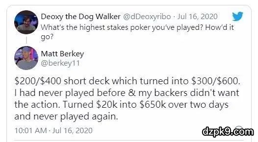 Matt Berkey,他最近和Ingram一起调查Mike Postle作弊案,帮助收集证据,但是说到高额桌的游戏,他也有经历。在一个$200/$400的短牌游戏中,他花了将近一半的钱去打这场游戏,结果在两天之内翻了30多倍。太刺激了~~