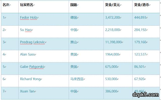 Fedor Holz在本次比赛中获得的奖金为HK$3,472,200 ($444,893),职业线下赛事累积奖金超过$23,354,884,是德国扑克金钱榜的第一名。在全球扑克金钱榜上,Fedor Holz的排名仅次于Phil Ivey之后,两者差距只有$501,150。