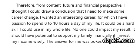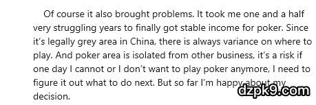 综上所述,无论是工作内容,职业未来还是收入前景,我都是觉得是时候要做出一些改变了。我想要一个充满乐趣的职业生涯,一个我能有激情投入每天10小时而不感到厌烦无聊的工作。我希望这份工作以硬技能为核心,我可以一生保有并不断提升。我的工作成果可以在很大程度上不受他人制约。这份职业的收入拥有潜力且可以保证我的家庭可以幸福生活。对我来说,扑克就是这个问题的答案。我从2013年开始学习德扑。这种游戏极易上手极难精通的特点感染了我。我逐渐开始了解到了牌手这个职业。我从游戏币开始试验,从1000币赢到100万,之后在全球最大的平台上继续盈利。这个过程中,打牌为生作为我的一个很好的职业选项逐渐清晰起来。这促使我最终在2017年做出了辞职的决定。通过扑克,我找到了激情,并且得以重新按照个人意志来决定自己的工作重心和时间分配。这份职业带了收获也带来了很多难题。我花了一年半左右的时间才最终达到了稳定盈利的状态,其间经历的各种压力不言而喻。由于中国的特殊情况,整个扑克环境有非常大的不确定性。同时这一行和其他的商业领域的交集非常少,导致假如有一天需要转行,我的退路相对也比较窄。但到目前为止我能接受这些问题并且过的还不错。