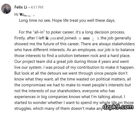 这就是我的故事啦。我和我太太提到你时总是说你是我遇到过的最好的老板了。你总是那么严格但是以身作则的工作,又事事都在为我们着想。替我问候你的丈夫和女儿们。半年之后再看自己写的东西,当时自己还是充满了乐观主义精神的。过去半年国内的扑克环境恶化还是非常明显的。29A9事件,各种各样的伙牌,机器人的入侵,都让盈利变得越来越困难。写下这篇文章只是希望和大家分享职业牌手的生活状态,而不是鼓励大家放弃工作走职牌这条路。与之相反,这几年的经历告诉我这条路对99%的人不适合。无处排解的压力,不断变化的外部环境,狭窄的交际圈,快速更新的扑克策略,反人性的学习方式,这些困难都不是可以通过简单的热爱和赚钱的欲望能克服的。我们的初心是对扑克的热爱。把扑克控制在你生活能承受的范围内,这种热爱才能永葆快乐,历久弥新。