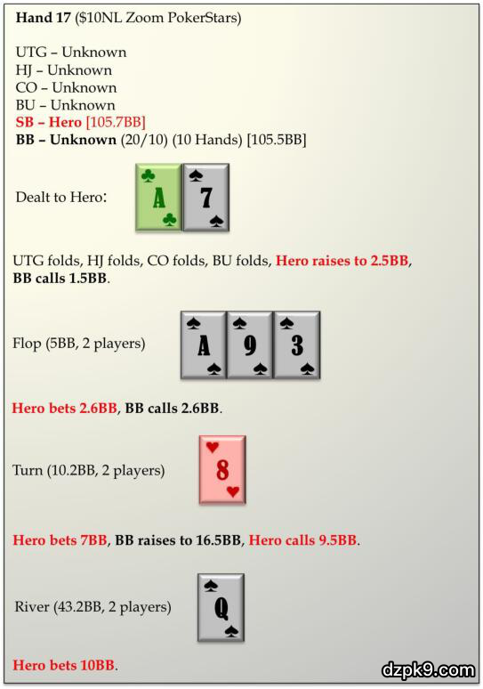 翻牌:A♠9♠3♠,Hero下注2.6BB,大盲跟注。转牌:8♥,Hero下注7BB,大盲位置玩家加注到16.5BB,Hero跟注。河牌:Q♠,Hero下注10BB。