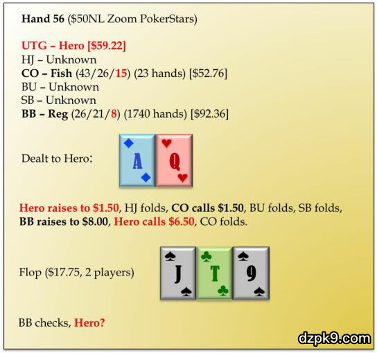 l 我会其余牌随后check,而且在大多数转牌面至少跟注一次。对手在这里有太多AQ-AK,因此,如果他不注意,他很容易在转牌圈过度诈唬。