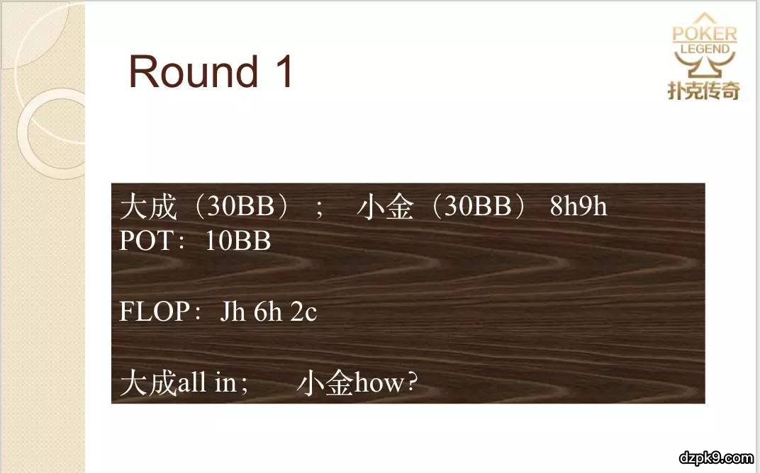 用一手牌来举例:玩家大成和小金都持有30个BB的筹码量(见上图),这时底池有10个BB的POT,FLOP发出3张牌分别是红桃J、红桃6和草花2。这时大成选择了ALL IN,而手持红桃8、9获得同花听牌的小金该怎么办呢?