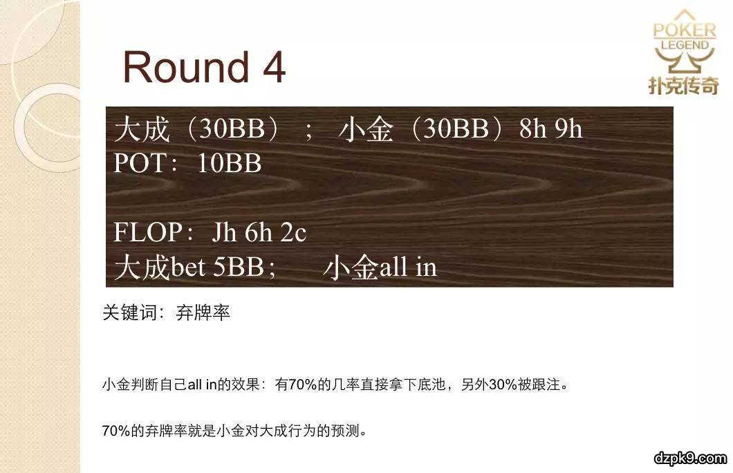 小金的猜测是70%,但这个概率也有可能只有30%,或者大成根本不会选择弃牌,那么这个时候小金就要为他自己的判断负责,根据他所认为对手“弃牌率”的多少,来对对手行为做预测。