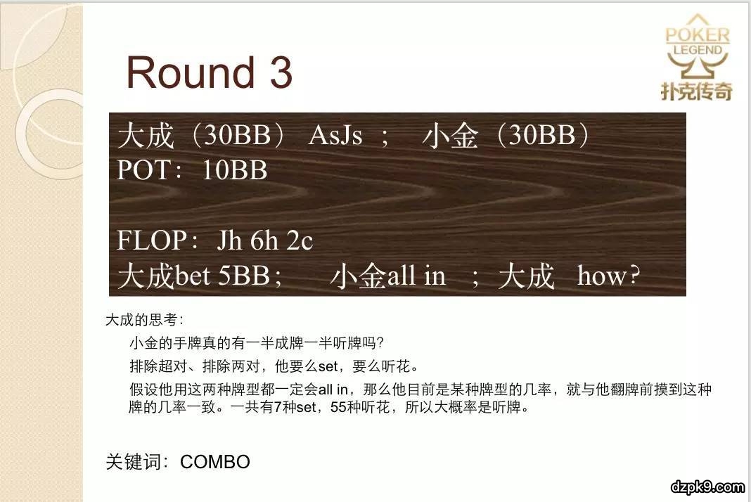 如果他击中Set的话,那会有7种Set,也就是COMBO。若是同花听牌便有55种听牌组合,因此大成判定小金同花听牌的可能性很大,于是大成决定跟注。