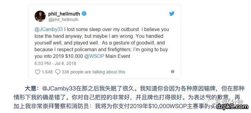 Hellmuth去年和消防官兵James Campbell的闹剧广为人知,Hellmuth因自己情绪问题而导致Campbell出局,事后Hellmuth因内疚而承诺为对方支付2019年WSOP主赛买入。